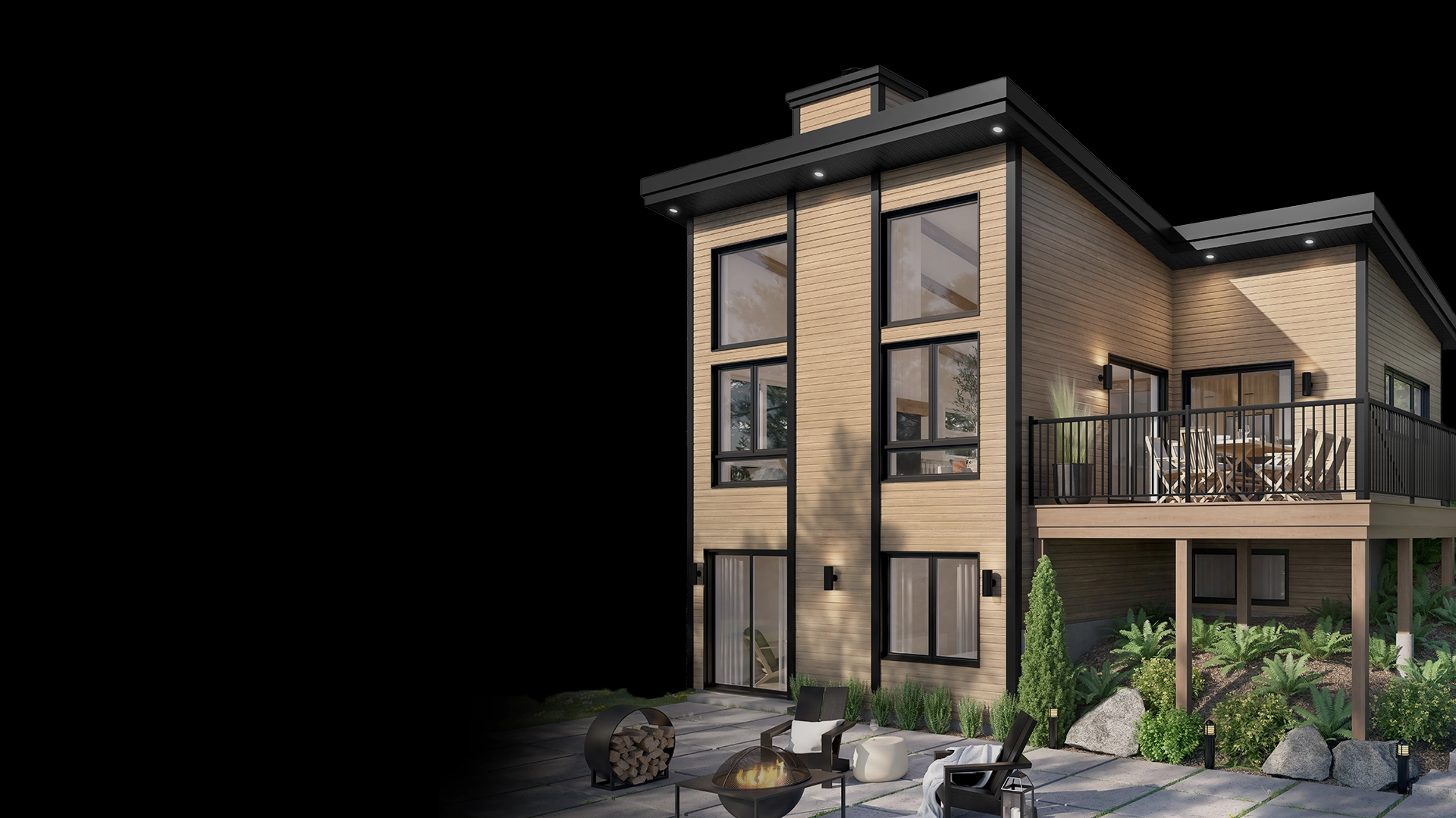 Façade Villégiature & Façade urbaine, une Vivô. S'implante aussi bien en nature qu'en ville! Plus flexible et futée que jamais. Côté rue et Panorama sur le jardin ou la vue!