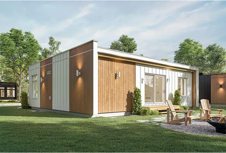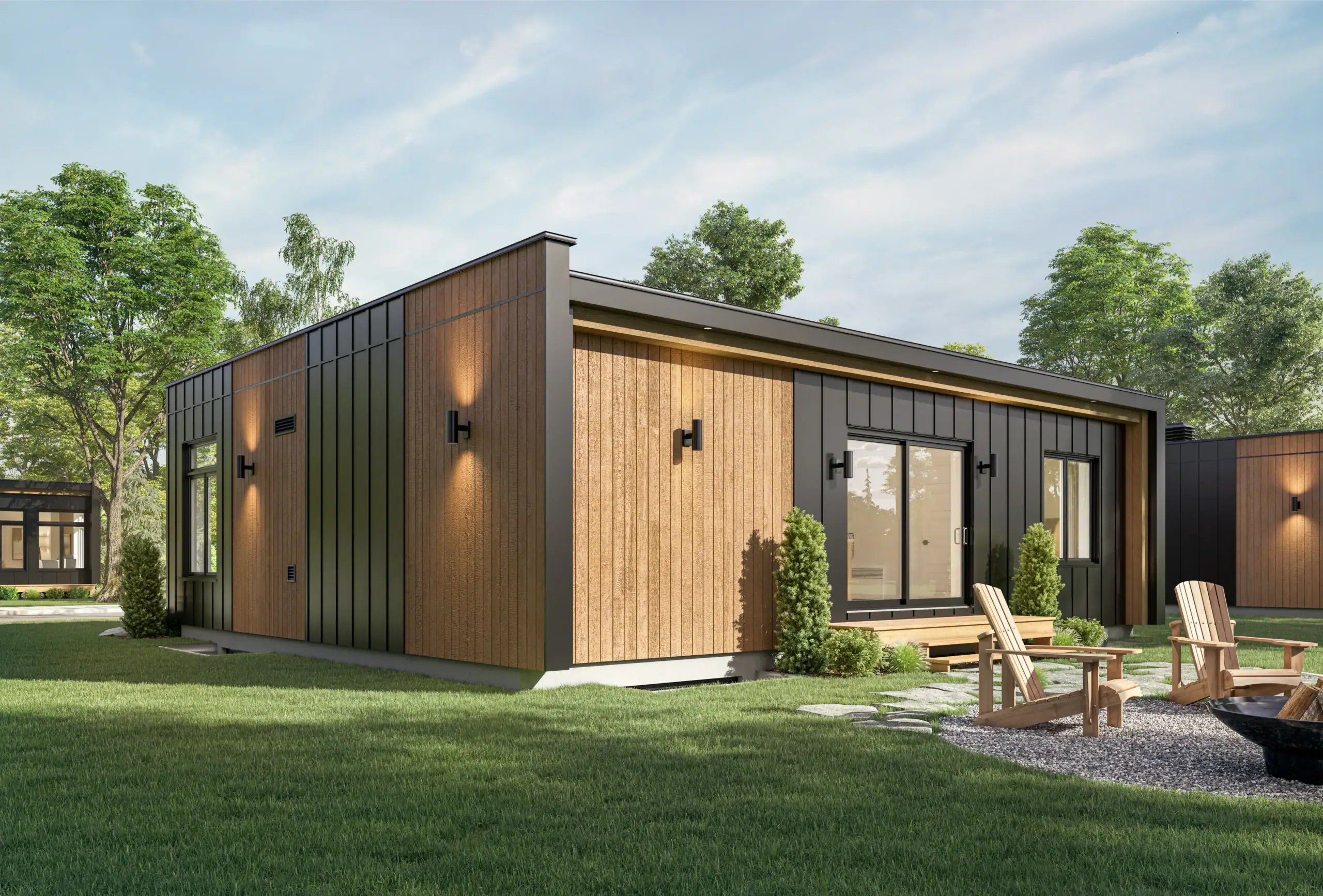 The Kenzô model stands out with its clean rectangular volume, subtle balance, and flat roof—signature elements of the Japandi style, a seamless fusion of Scandinavian minimalism and Japanese aesthetics. Its façade blends warmth and modernity through alternating wood‑effect and exterior cladding, highlighted by a graphic frame that adds refined, contemporary contrast. Available in black or white, this model combines thoughtful design, comfort, and a serene vacation‑home atmosphere.
