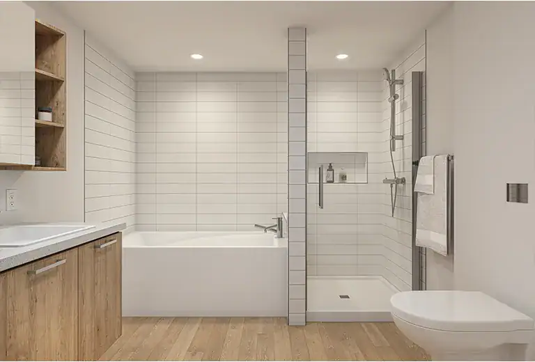 • A full bathroom with bathtub, independent shower, toilet, and wall‑mounted cabinetry for easy maintenance
