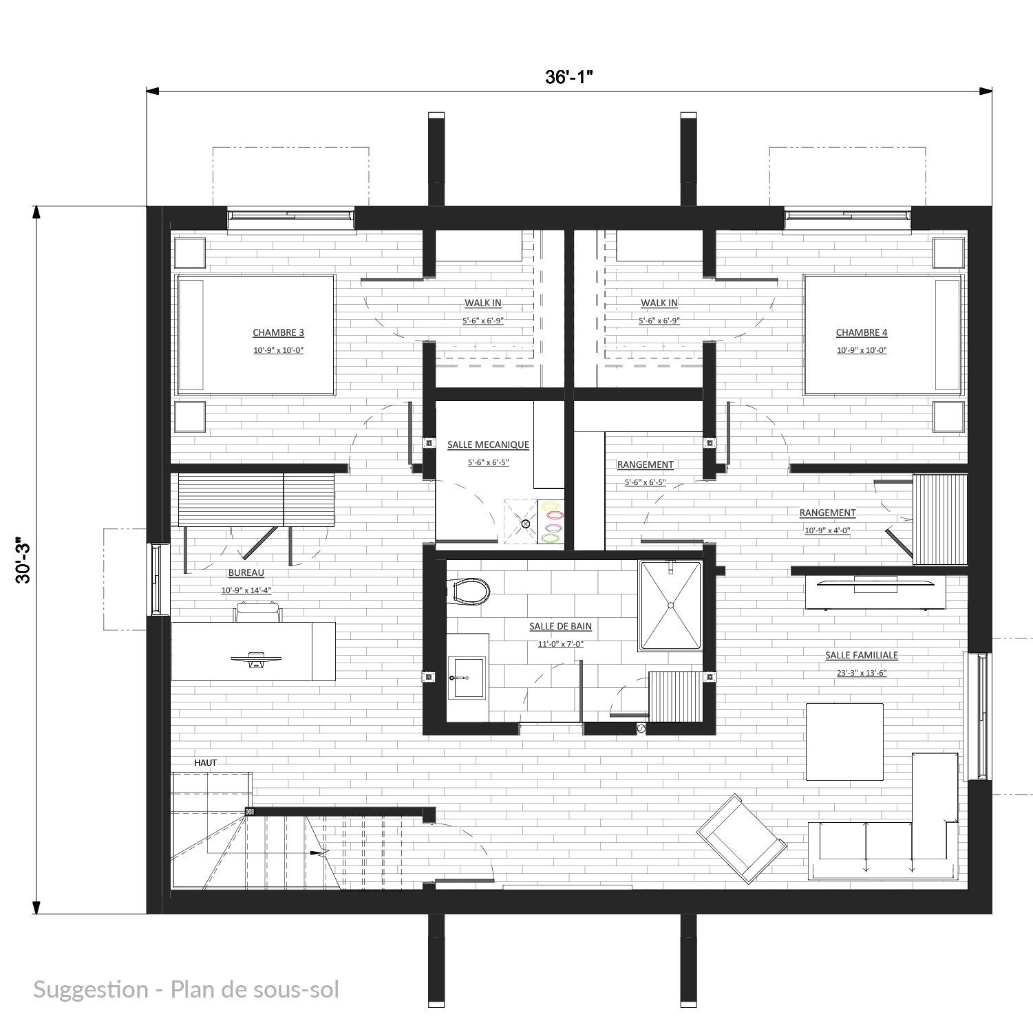 • Entrée avec garde-robe, coin banquette, espace escalier ou rangement selon le type de fondation choisie