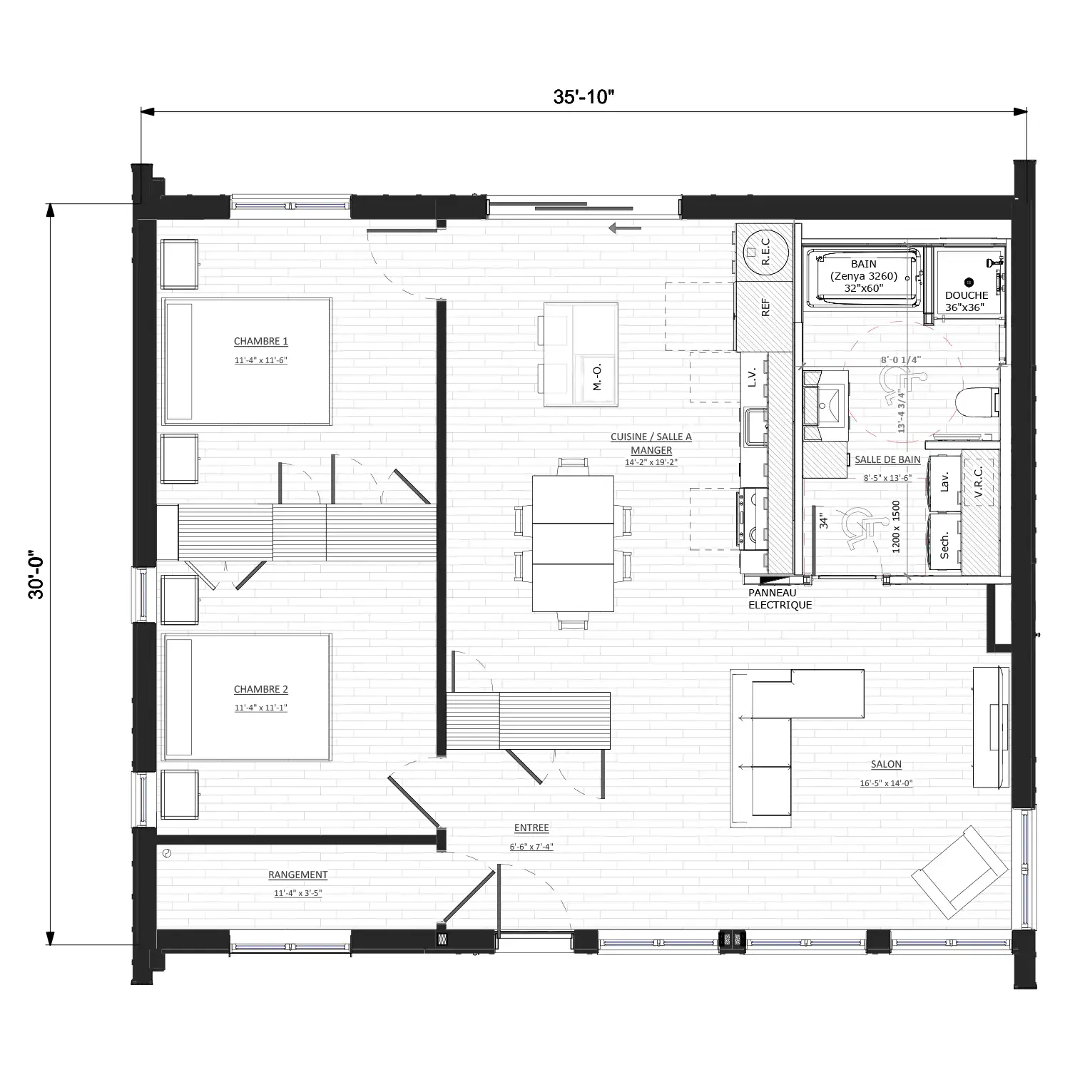 Son noyau technique à valeur ajoutée est 100% préfabriqué intègre l’électricité, la ventilation, la plomberie ainsi que les équipements de la cuisine et de la salle de bain. Le résultat : un module rapide à installer sur chantier, permettant un gain de temps considérable et une connexion simplifiée aux services lors de l’installation sur vos fondations.