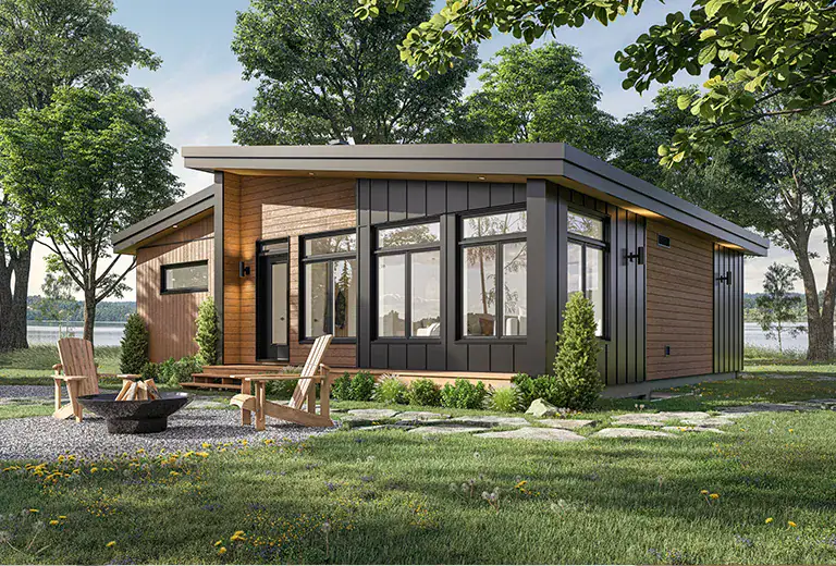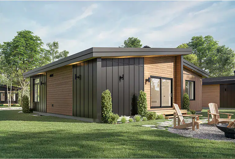 Avec ses toits en pente inversée, inspirés du modernisme Mid-Century, Sayô affirme une géométrie audacieuse. Le rythme de ses volumes et le contraste de ses matériaux et couleurs lui confèrent un style villégiature résolument contemporain. Décliné en noir ou en blanc, Sayô séduit par sa luminosité généreuse, ses vues ouvertes et son potentiel d’intégration harmonieux au paysage.
