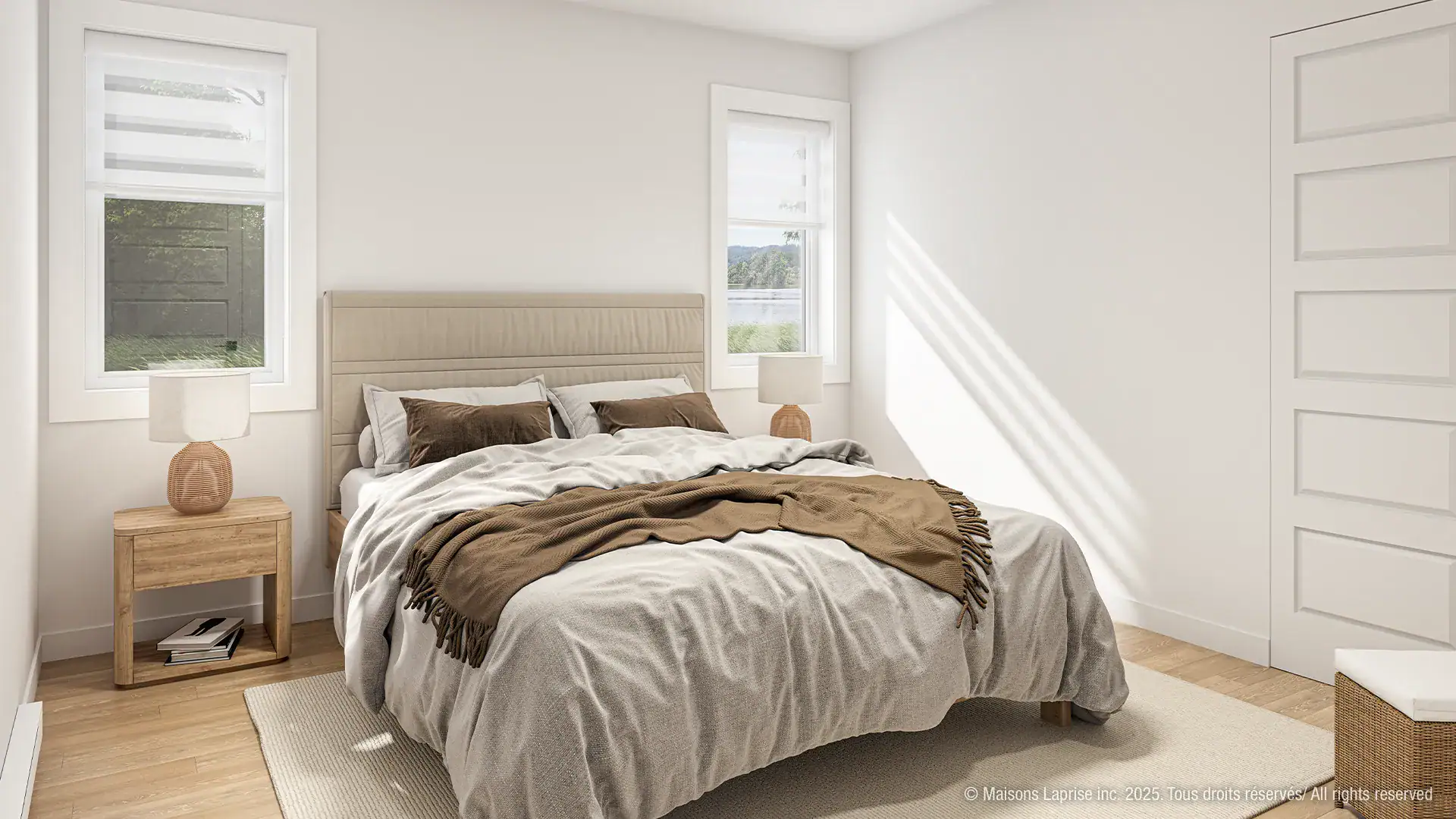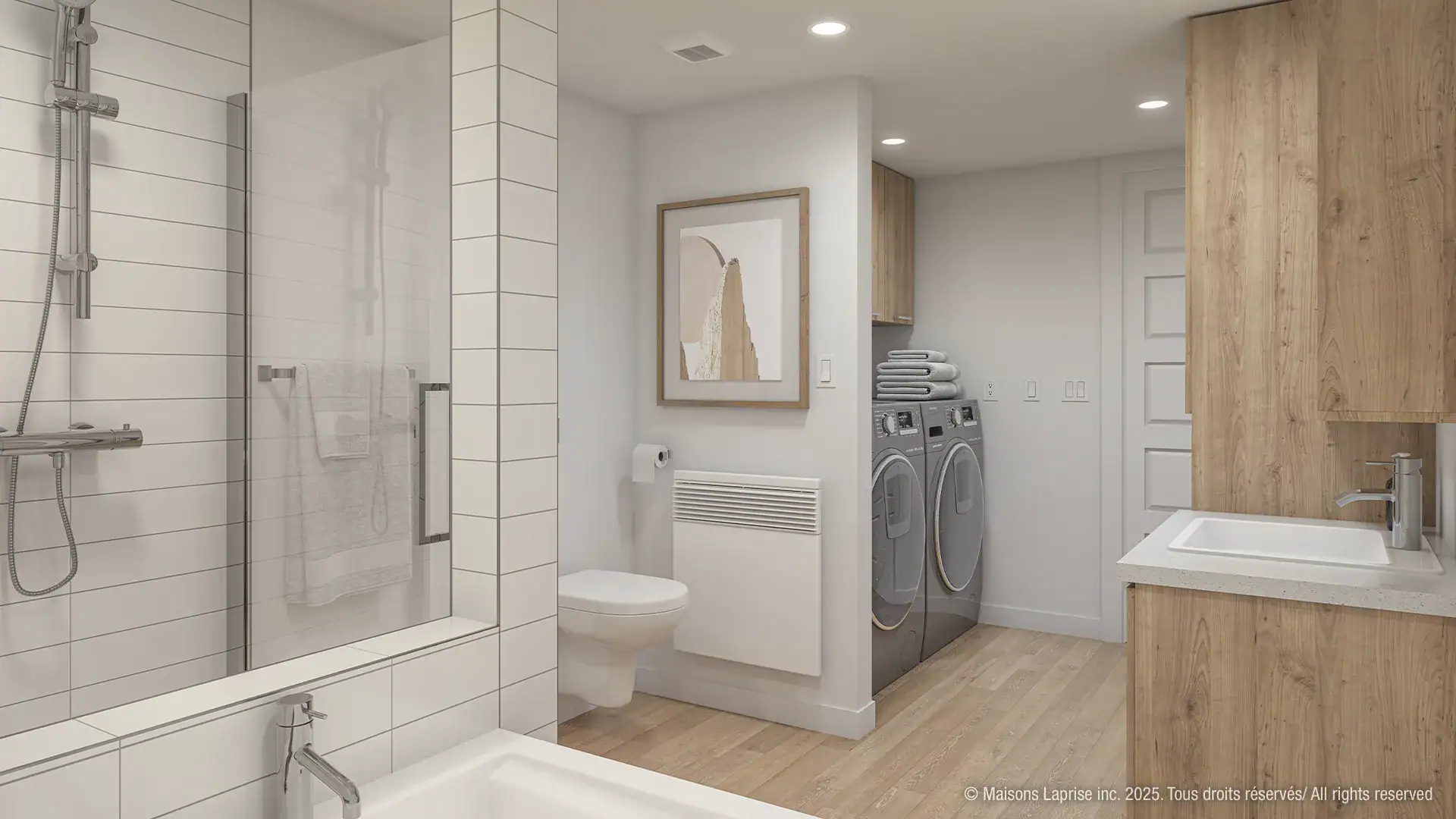 Côté pratique, le modèle comprend deux chambres avec penderies, une entrée fonctionnelle avec garde-robe et coin pour banquette, ainsi qu’une salle de bain complète avec bain, douche européenne indépendante, toilette et mobilier suspendu pour un entretien simplifié, sans oublier une buanderie intégrée.