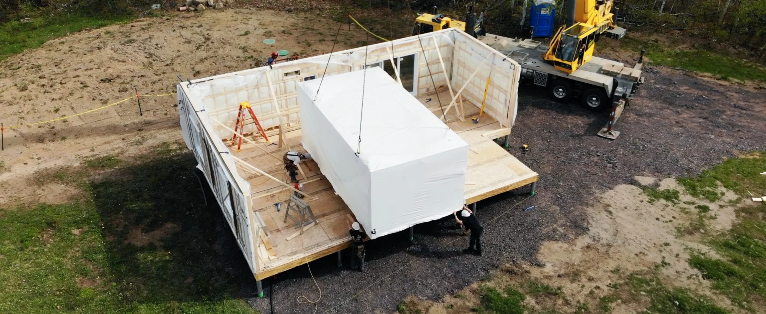 On se charge du gros technique pour vous. On préfabrique le pod mécanique (ventilation, électricité, plomberie) et la structure de la maison en usine. On y inclut des caractéristiques de série (cuisine, salle de bain, garde-robes). On fabrique, on livre et on installe le système sur votre chantier.